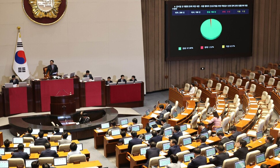 이날 본회의에 앞서 국민의힘은 의원총회를 열어 김건희 특검법 반대를 당론으로 정해, 대다수 의원들이 표결에 불참했다. 하지만 본회의에 참석한 조경태·안철수·김예지·김재섭·배현진·한지아 의원 등 6명은 찬성표를 던져, 김건희 특검법은 재석 198명 가운데 찬성 194명, 반대 3명, 기권 1명으로 가결됐다. 조경태 의원은 이날 문화방송(MBC) 라디오에 출연해 “국민 대통합을 위해서라도 김건희 특검법 등은 반드시 통과시켜야 한다”고 말했다. 김소희·박수민·우재준 의원 등 3명은 반대 표결을 했다.