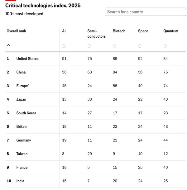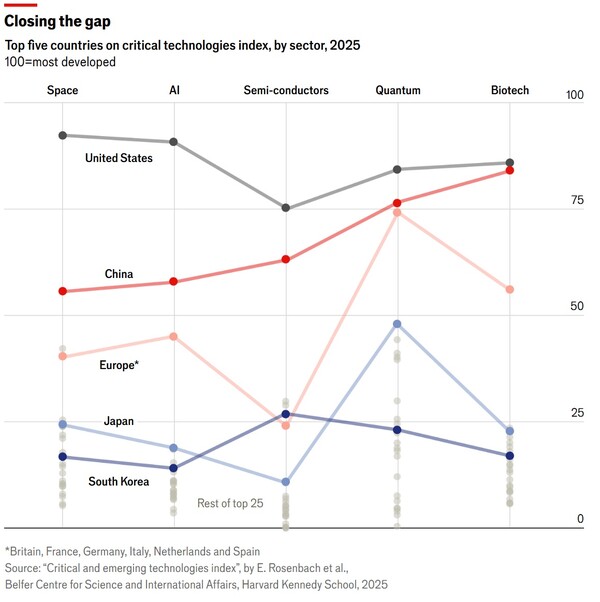 영국 주간 <이코노미스트>가 6일 보도한 관련 기사에 따르면, 유럽(6개국 통합)을 포함한 주요 5개국 기술경쟁 추이에서 미국이 전반적으로 우위를 차지하고 있으나, 다른 경쟁국들의 추격을 받고 있다. 상승속도가 빠른 중국이 미국 수준에 근접하면서 격차를 급속히 좁히고 있는 것으로 나타났다. 한국은 반도체 분야에선 유럽과 일본을 추월했으나 다른 분야에선 뒤처져 있으며, AI와 생명공학 분야에서 일본과의 격차를 좁히고 있다. 미국과 중국은 우주와 AI 분야에서 여전히 격차가 크지만, 양자기술과 생명공학 분야에서는 서로 근접하고 있다.