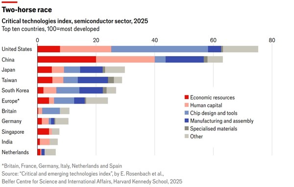 <이코노미스트>에 따르면, 5개 분야 중에서 정치인들의 관심이 가장 많이 쏠리고 있는 것은 AI분야다. 제임스 데이비드 밴스 미국 부통령은 최근 AI개발을 “군비 경쟁”(arms race)이라 불렀다. 미국은 초기 혁신(breakthroughs) 성과와 컴퓨팅 파워 구축 선점, 그리고 오픈AI와 엔비디아 같은 기업들의 우위를 토대로 강력한 선두를 달리고 있다.