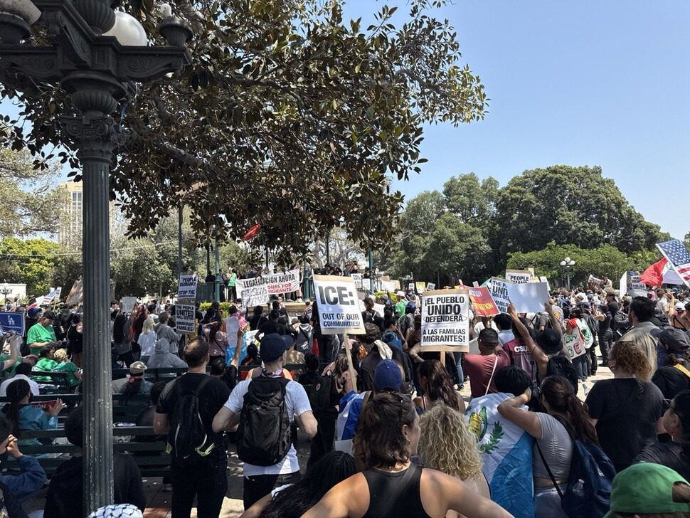 만약 정말로 시위가 격화되어 7만5천명으로는 턱도 없다면, 주정부가 먼저 연방 지원을 요청했을 것이다. 실제 올 초 대형 산불 당시 주정부는 연방 지원을 요청하기도 했으나 트럼프 대통령은 마지못한 태도를 보였다. 반면 이번엔 주정부도 로스앤젤레스시도 거부한 ‘지원’을 트럼프 행정부가 먼저, 그것도 강제로 밀어붙였다. 군 투입 소식은 오히려 “불길에 기름을 붓는”(개빈 뉴섬 캘리포니아 주지사) 형국이 됐다. 사흘째 시위는 한층 규모가 커졌다.