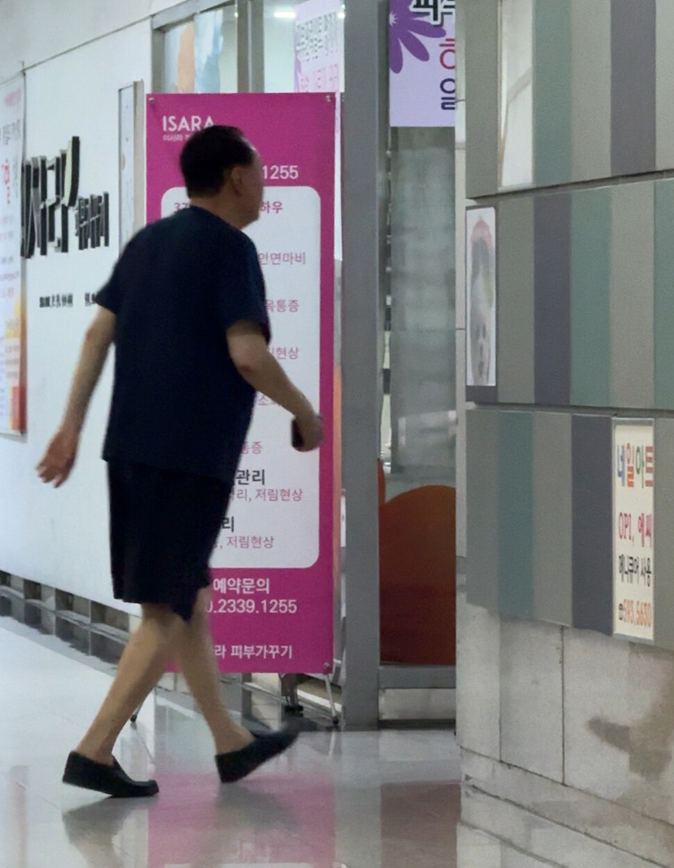 한국일보가 공개한 사진과 영상을 보면, 윤 전 대통령은 이날 오전 11시20분께 아크로비스타 지하상가에 있는 한 갤러리에서 나와 건강·미용 관련 가게들이 모여있는 구역으로 이동했다. 경호원들이 윤 전 대통령을 뒤따르는 모습도 영상에 담겼다.