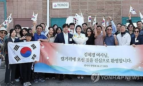 김 여사는 17일 오전 캐나다 앨버타주 캘거리의 한인회관을 찾아 밴쿠버 한인회장, 캘거리 한인회 및 여성·문화단체 대표를 비롯해 한글학교 교장, 대학교수, 유학생 등 교민들을 만났다. 영부인으로서 대통령 없이 수행한 첫 단독 일정이다.
