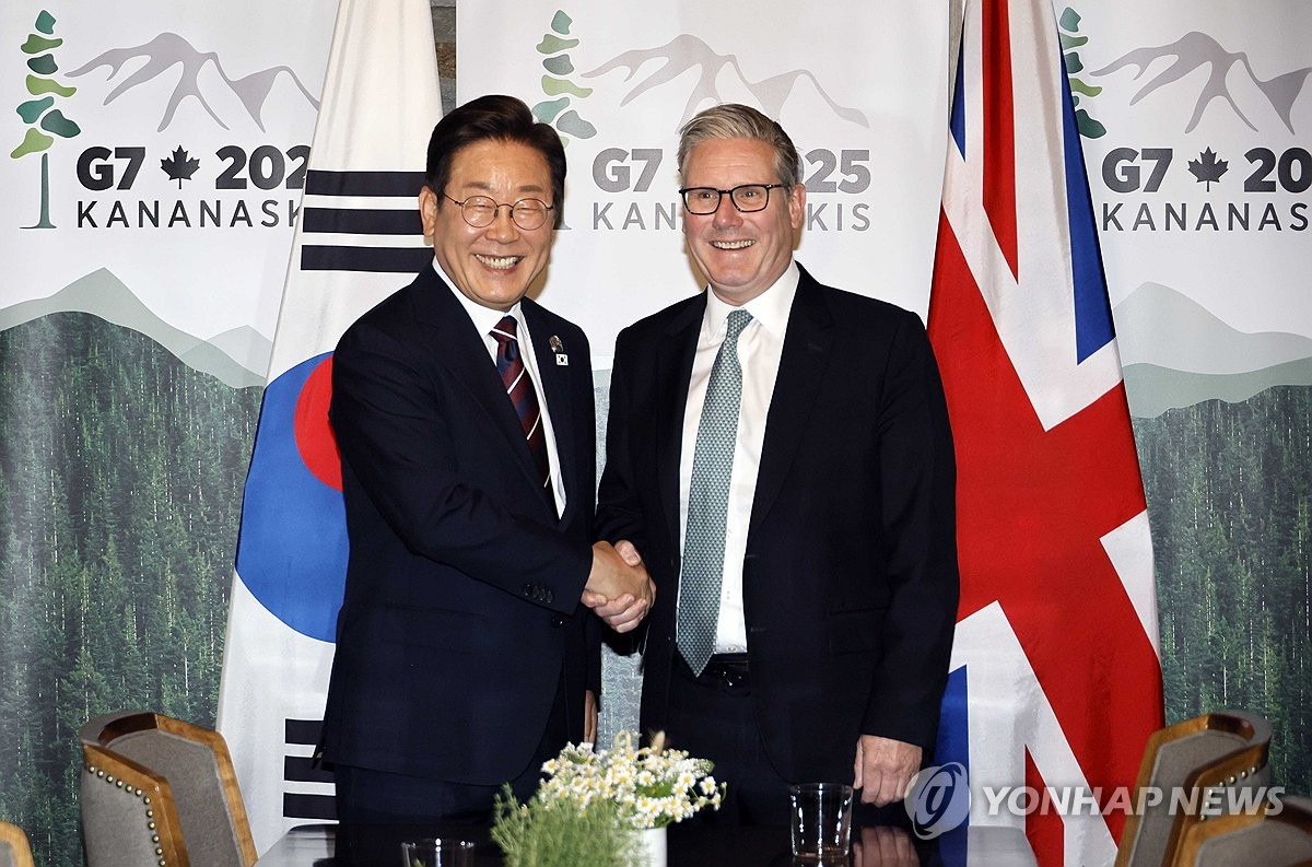이재명 대통령, 한-영 정상회담 = 이재명 대통령이 17일 캐나다 앨버타주 캐내내스키스 주요 7개국(G7) 정상회의장에서 키어 스타머 영국 총리와 한영 정상회담 전 악수하고 있다. 2025.6.18