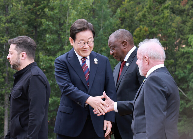 이재명 대통령이 17일(현지시각) 캐나다 앨버타주 캐내내스키스 주요 7개국(G7) 정상회의장에서 G7 및 초청국 기념촬영 후 루이스 이나시우 룰라 다 시우바 브라질 대통령과 악수하고 있다. 김태형 기자