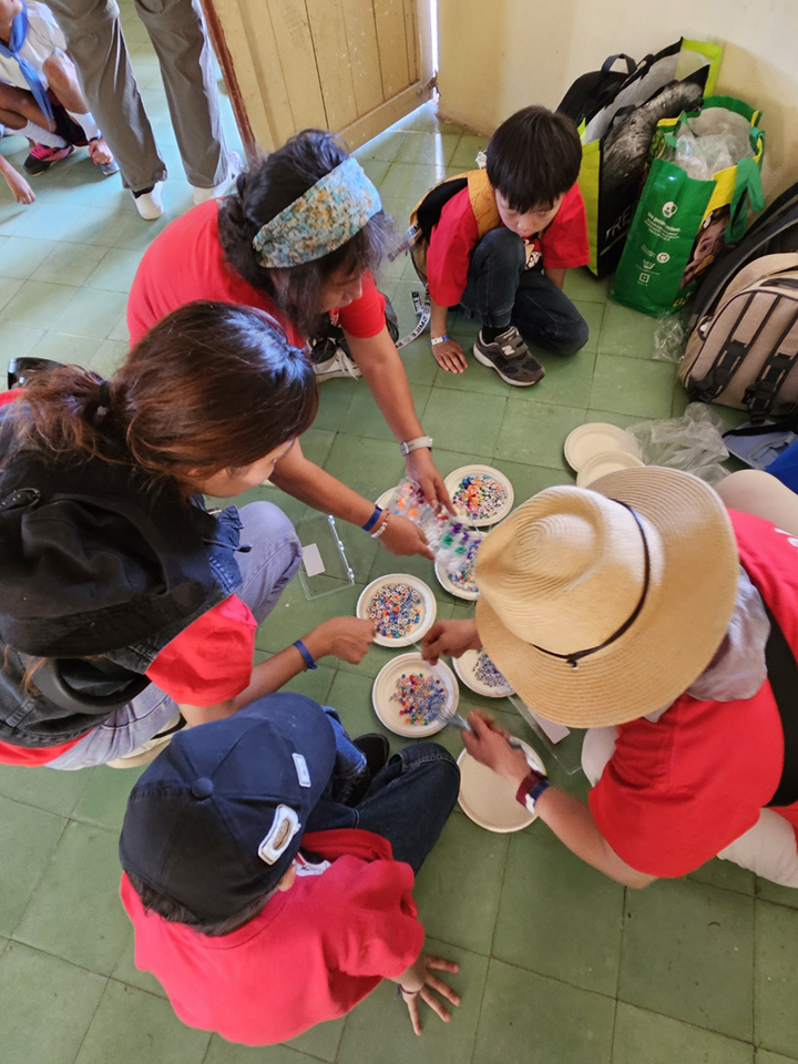 학교 사역은 손주들이 더 적극적으로 참가하게 되었다. 학교 아이들에게 선물을 나누어 주고 먼저 비즈 공예로 자기 이름을 알파벳으로 찾아서 팔찌를 만들었다. 작은 알파벳과 큰 알파벳 두 가지를 가지고 만드는 것이었다. 아이들이 심취해서 만드는 모습이 정말 아름다웠다. 아이들은 알파벳을 찾느라고 고심하며, 땀을 뻘뻘 흘렸다.