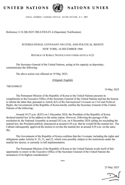 22일 한겨레가 유엔국제조약 누리집을 통해 확인한 대한민국 정부의 통지문을 보면, 유엔 주재 대한민국 대표부는 지난달 19일 유엔 사무총장에게 “2024년 12월3일 오후 10시27분께(한국시각), 대한민국 대통령은 전 국민에게 계엄령을 선포했다. 그러나 12월4일 오전 1시2분께 국회에서 계엄령 해제를 촉구하는 결의안이 통과되자, 대통령은 오전 4시20분께 계엄령 해제를 공식 발표했고 이후 국회는 같은 날 오전 4시29분께 계엄령 해제 안건을 승인했다”는 서한을 보냈다.
