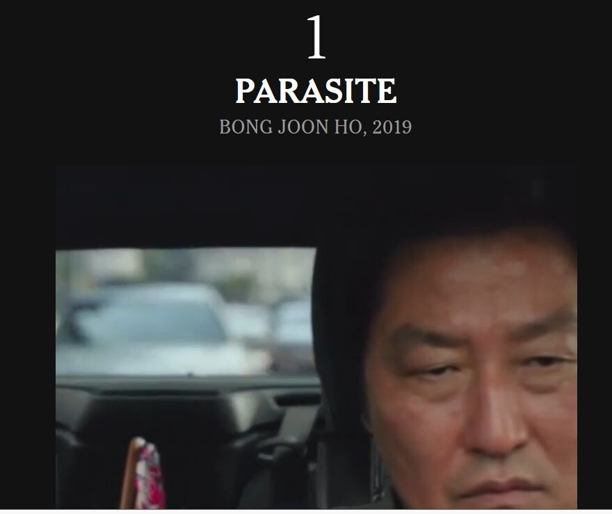 뉴욕타임즈는 1위에 뽑힌 ‘기생충’에 대해 “가진 자와 못 가진 자의 이야기이자, 신자유주의가 초래한 폐해에 대한 맹렬한 반박인 봉준호의 이 불쾌하면서도 기묘하게 즐거운 작품은, 빈곤한 한 가족이 부유한 가정에 서서히 스며드는 과정을 따라간다. 장르의 관습에 얽매이지 않는 거장 봉준호는, 영화 전체에 과장된 코미디와 날카로운 사회 풍자를 능수능란하게 넘나들면서 종국에는 비극적인 폭력의 발작으로 불태워버린다. 그 순간은 충격적일 뿐 아니라, 피할 수 없는 운명처럼 느껴진다”고 평했다.