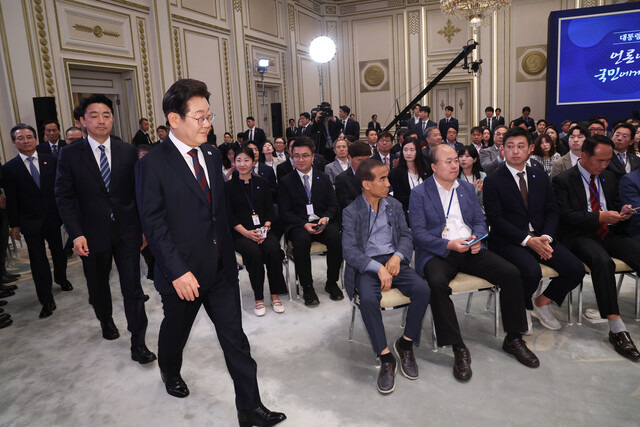 검찰 인사 논란에 대해서도 다시 한 번 설명하며 양해를 구했다. 이 대통령은 “(검찰 개혁) 과정에 검찰 인사 문제가 걸려 있다. 그런데 제가 자주 말하는 것처럼 검찰 개혁은 국회가 하는 것이다. 검찰도 정부 일원이니 정부 안에서 (검찰 개혁을) 타협해서 정할 문제가 아니다. 국회가 입법적으로 결단할 사안이기 때문에 정부에서 할 일은 그로 인한 갈등, 부작용을 최소화하는 게 필요하다. 이를 위해 대통령실 안에도 정부 안에도 검찰을 잘 이해하는 사람이 맡는 게 유용성이 있겠다는 판단을 한 것”이라고 설명했다. 봉욱 민정수석, 정진우 서울중앙지검장, 성상헌 법무부 검찰국장 등 임명 논란에 대해 검찰 출신 인사의 쓰임을 설명하는 동시에 검찰 개혁은 타협 대상이 아니라는 점을 분명히 한 것이다. < 기민도 기자 >