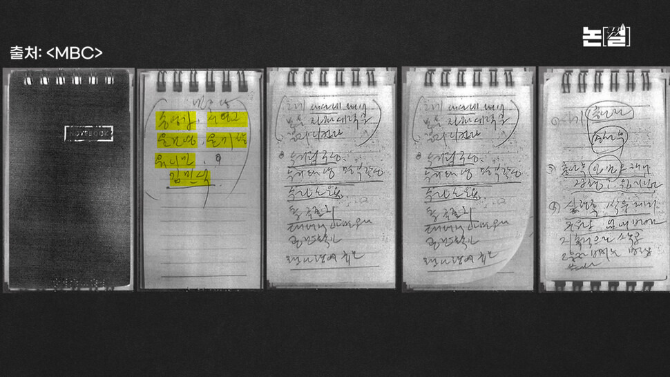 이른바 ‘노상원 수첩’의 글씨는 급하게 흘려 쓴 것이어서 누군가의 지시를 메모했을 가능성이 크죠. 수첩에서 ‘수거 대상’으로 거론된 그 많은 이름과 단체들을 노상원 혼자 정리했을 거라고 보는 게 오히려 비합리적입니다. 노씨는 지난 7일 구속이 연장됐습니다. 폭파, 격침, 독극물 사살, 북한 공격 유도 등 온갖 잔인한 살상 방안이 적혀 있는 이 수첩 내용을 노씨가 혼자 작성했다는 주장을 과연 끝까지 고수할지, 지켜봐야겠습니다. 그 전에 특검이 김건희-노상원 두 사람의 비화폰 통화 내역을 확보할 수도 있을 겁니다.