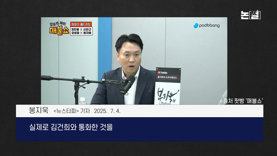 봉지욱: 이거 아마 특검에서는 알 텐데. (중략) 노상원 롯데리아 회동 있었잖아요. 노상원이 비화폰을 들고 다니면서 실제로 김건희와 통화한 것을 롯데리아 회동 당사자들이 목격을 두 차례 이상 했습니다. 이 사실을 검찰에서 진술을 했어요. (중략) 우리는 김건희가 시켰을 것이다. 윤석열의 그 머리로 이렇게 할 수 없다고 했잖아요. 여러 가지로 봤을 때 모든 결정은 김건희가 했을 것이다, 그런 의심을 했는데 저는 그게 사실인 거 같더라고요. (7월 4일 ‘매불쇼’)