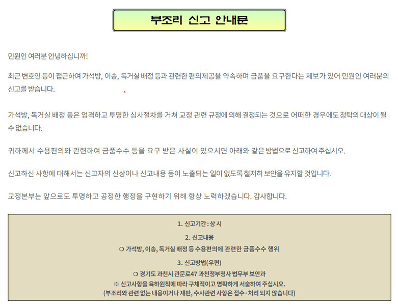 브로커를 통한 독방 거래 역시 처음 있는 일이 아니다. 대법원은 2020년 알선수재 혐의로 기소된 판사 출신 변호사 김아무개씨에게 징역 10개월에 집행유예 2년을 확정했다. 김씨는 2016년∼2018년 서울남부구치소 혼거실에 수용 중이던 수용자 3명에게 “1100만원을 주면 서울교정청이나 내부에 있는 교정공무원을 통해 독거실로 옮겨주겠다”며 3300만원을 받았다. 법원은 “수용자들은 피고인을 ‘독거실로 보내주는 판사 출신 변호사’라고 소개받았고 돈을 지급한 사람 중 일부는 실제로 독방에 배정받았다”고 밝혔다. 2019년에는 법무부 교정본부가 “최근 변호인 등이 접근해 독거실 배정 등과 관련한 편의제공을 약속하며 금품을 요구한다는 제보가 있어 신고를 받는다”는 부조리 신고 안내문을 누리집에 게시하기도 했다.