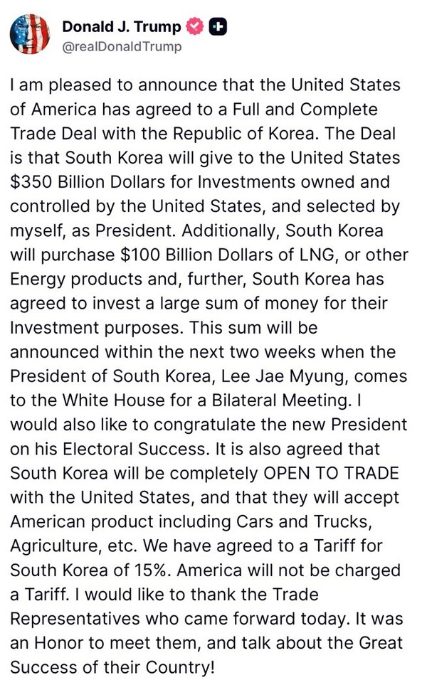 "(내가 부과한) 관세들은 오랜 세월 동안 한국/일본의 관세와 비관세, 정책 및 무역 장벽을 수정하는 데 필요하다. 미국에 지속 가능하지 않은 무역적자를 일으키기 때문이다. 무역적자는 우리 경제에 주요 위협이다. 국가안보에도 위협이다!" (7월 7일, 트럼프 서한)