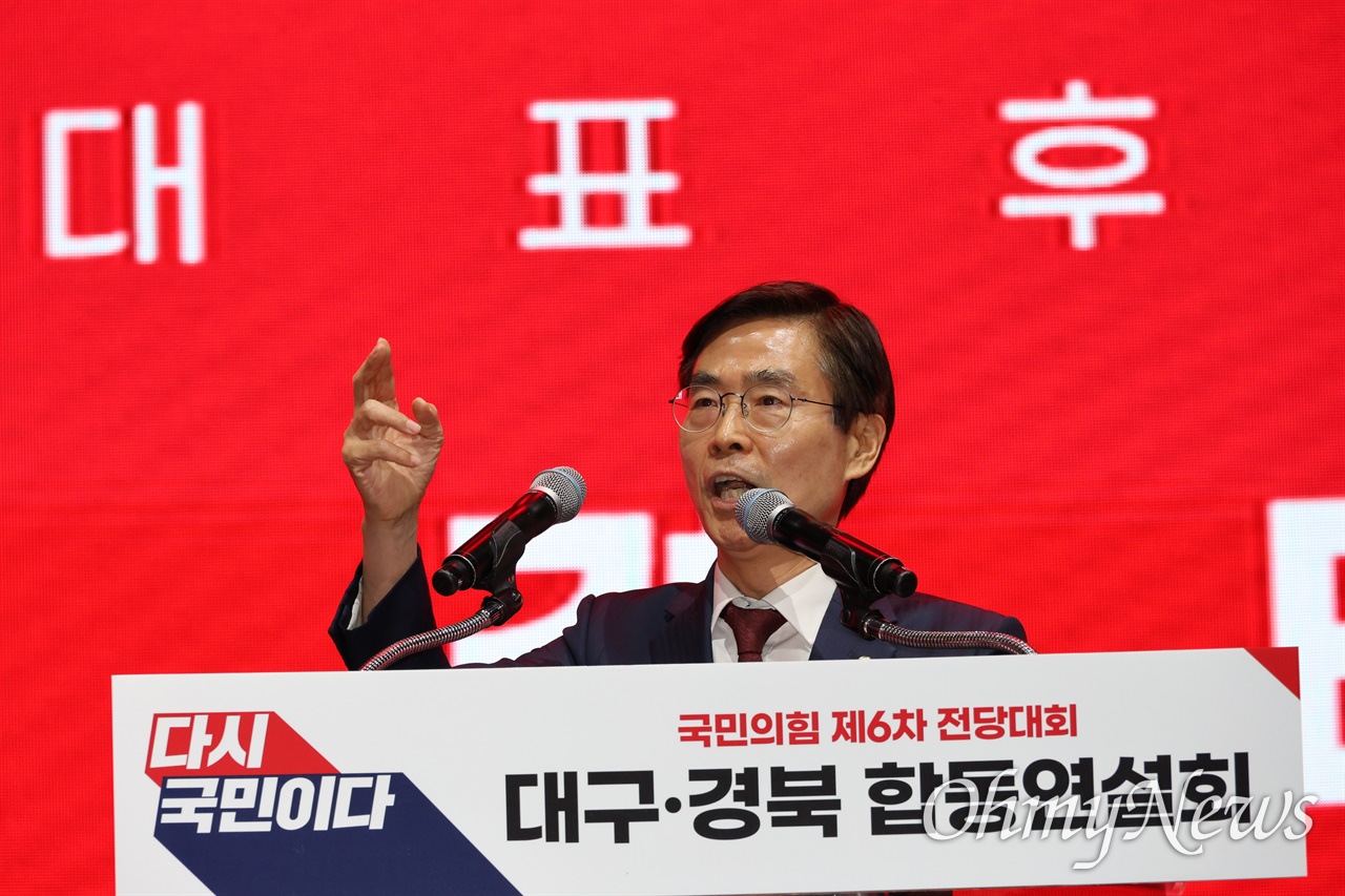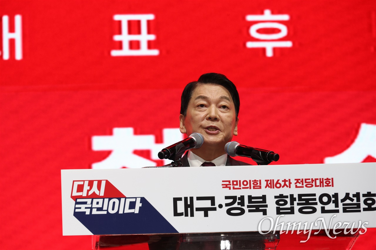 ▲8일 오후 대구 엑스코에서 열린 국민의힘 전당대회 대구경북 합동연설회에서 연설하고 있는 안철수 당대표 후보, ⓒ 조정훈
