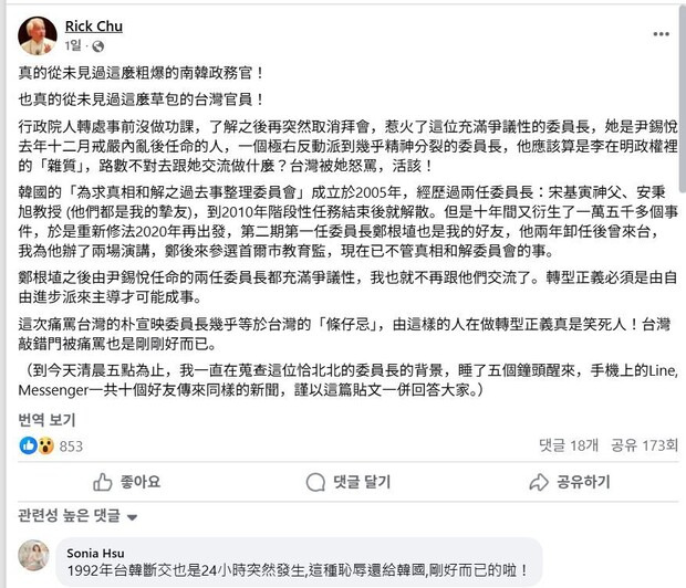 주리시 회장은 페이스북 글에서 또 “2005년 출범한 1기 진실화해위가 2010년 해산됐지만 2020년 법 개정 뒤 2기가 시작됐다”며 한국 과거사 조사기구의 역사를 설명한 뒤 송기인·안병욱·정근식 등 역대 위원장과의 친분을 밝히기도 했다. 이어 “정근식 위원장 이후 윤석열이 임명한 두 명의 위원장은 논란이 많아서, 나는 그들과는 더는 교류하지 않는다”고 했다. 두 명의 위원장 중 한 명은 김광동 전 위원장을 이르는 말이다 그는 마지막으로 “이행기 정의는 반드시 자유·진보진영이 주도해야 성공할 수 있다”며 “이번에 대만을 호되게 비난한 박선영 위원장 같은 사람이 과거사 정의를 다룬다는 것 자체가 우스운 일이다! 대만이 문을 잘못 두드려 욕을 먹은 것도 충분히 이해된다”고 썼다.