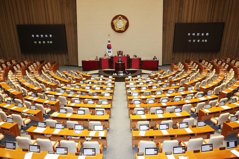 민주당은 23일부터 노란봉투법(노동조합 및 노동관계 조정법 2·3조 개정안)과 두 번째 상법 개정안도 ‘상정→24시간 필리버스터→표결’을 반복하며 25일까지 순차적으로 처리한다는 계획이다. < 고한솔 기민도 기자 >