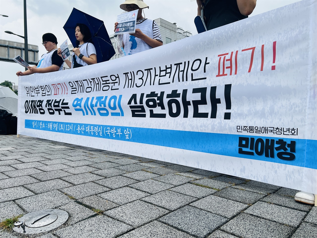 이에 광복 80년을 맞아 민족통일애국청년회(이하 민애청)은 자주통일실천단을 운영하며 용산 대통령실 앞에서 한일 과거사 문제 해결을 촉구하는 기자회견을 진행했다.