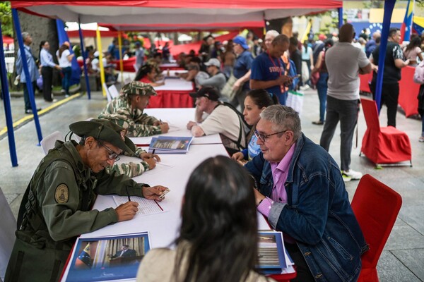 베네수엘라 카라카스의 볼리바르 광장에서 29일 시민들이 미 제국주의에 맞서자는 니콜라스 마두로 대통령의 호소에 따라 민병대 입대에 나서고 있다. 2025. 08. 29 [AFP=연합]