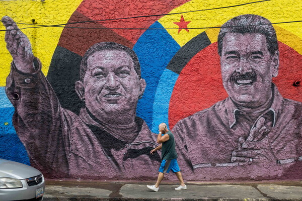 베네수엘라 카라카스에서 반미 집회가 벌어지는 가운데 29일 한 시민이 니콜라스 마두로 대통령(사진을 바라보며 왼쪽)과 고 우고 차베스 전 대통령의 뮤럴 옆을 지나고 있다. 2025. 08. 29 [EPA=연합]