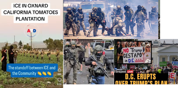 사진 1. 왼쪽부터 시계방향으로, 복면에 중무장한 이민국 요원과 맞서는 농장주와 이민 노동자들. 무장요원들이 차를 세우고 강제로 운전자를 끌어내리는 현장(캘리포니아); 트럼프의 군대 배치 항의집회—“트럼프 게슈타포는 DC를 떠나라”라는 손팻말이 눈에 띈다(워싱턴 DC); 완전무장한 채 주택가에 들이닥치는 이민국 단속요원들(일리노이).