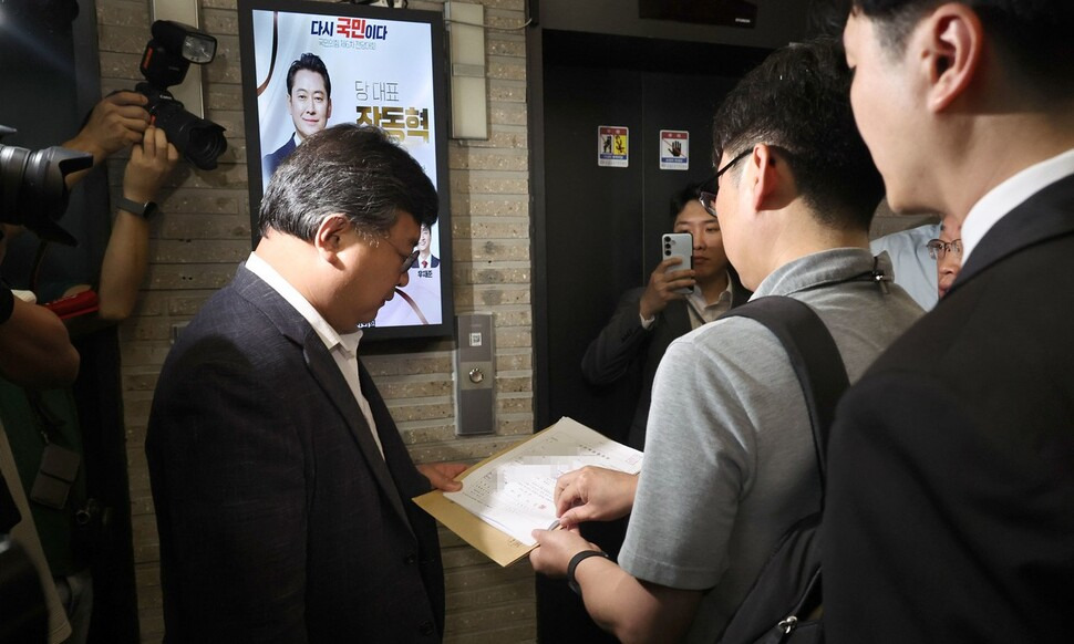 김건희 여사 관련 의혹을 수사하는 민중기 특별검사팀은 전날 오후 서울 여의도 국민의힘 중앙당사 인근에 있는 당원 명부 관리 업체에 검사와 수사관을 보내 압수수색 영장을 집행했다. 특검팀은 전날 오전부터 영장 집행에 나섰으나 국민의힘 쪽 반발에 부딪혀 7시간30여분 대치하다가 프로그래밍을 통해 당원 가입 데이터를 추출하는 방식으로 영장을 집행했다.