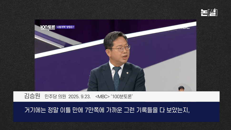 “거기에는 정말 이틀 만에 7만쪽에 가까운 그런 기록들을 다 보았는지, 그러니까 전산 로그인 기록도 좀 확인을 해야 될 거 같고요. 그다음에 재판 연구관들이 사건이 대법원에 오기 전에 미리 검토하고 있었다라는 의혹도 있거든요. … 그다음에 사법 역사상 이런 경우는 정말 처음인데요. 대법원 전원합의체는 대개 한 3년 넘게 기간이 걸리는데 9일 만에 이런 선고를 한 것이 과연 사법의 정치적 중립이라든가 독립에 어떤 영향이 있는지를 관계 교수님이라든가 전문가를 불러서 한번 그런 의견도 들어봐야 될 것 같습니다.”(김승원 민주당 의원, 23일 MBC ‘100분토론’)