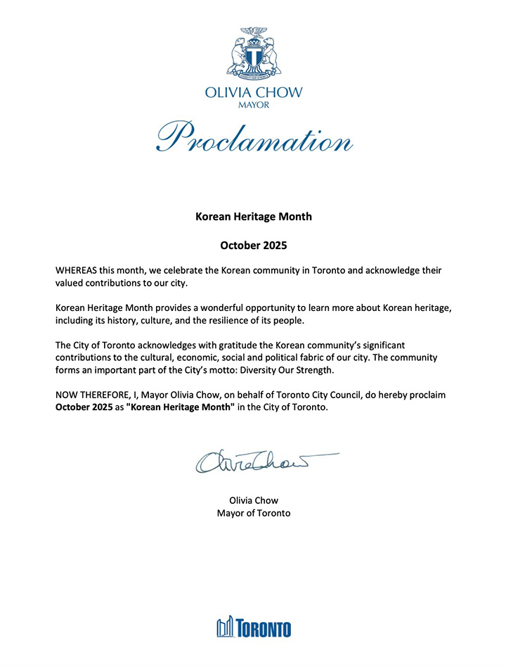 시의회 결의를 받아 올리비아 차우 시장은 한국 문화유산의 달 선언문을 발표, 한인 커뮤니티가 문화와 음식은 물론 혁신과 기업가정신 전반에서 토론토의 활력과 다양성을 이끌어 왔다고 강조했다.
