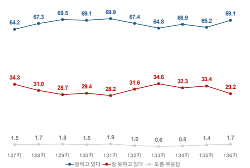 이재명 대통령의 국정운영 평가는 전화면접조사 기준 ‘긍정’ 69.1%, ‘부정’ 29.2%로 나타났다. ‘긍·부정’ 격차는 39.9%p. 지난주 조사에 비해 ‘긍정’은 3.9%p 오르고 ‘부정’은 4.2%p 내렸다.