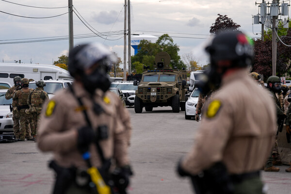 1일, 미국 일리노이주 시카고 교외의 브로드뷰에 있는 브로드뷰 이민단속국(ICE) 시설 근처 시위 현장에 무장 경찰 차량이 보인다. 이는 도널드 트럼프 미국 대통령이 범죄 예방 지원을 위해 연방 법 집행력 주둔을 늘리도록 명령한 데 따른 것이다. 2025. 11. 01 [로이터=연합]