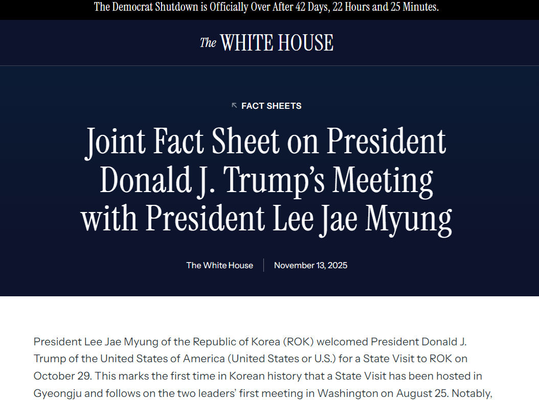 도널드 트럼프 미국 행정부는 13일 한국과 공동으로 팩트시트를 발표했다. 지난 10월29일 경주에서 이뤄진 한·미 정상회담에서 합의한 내용을 담았다. 다음은 미국 측 팩트시트의 주요 내용을 요약한 것이다.
