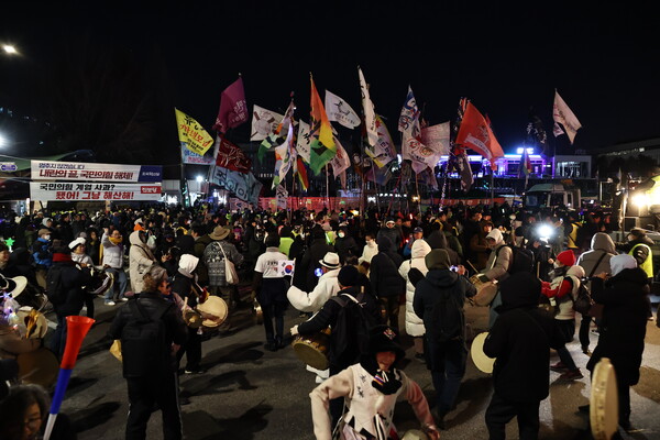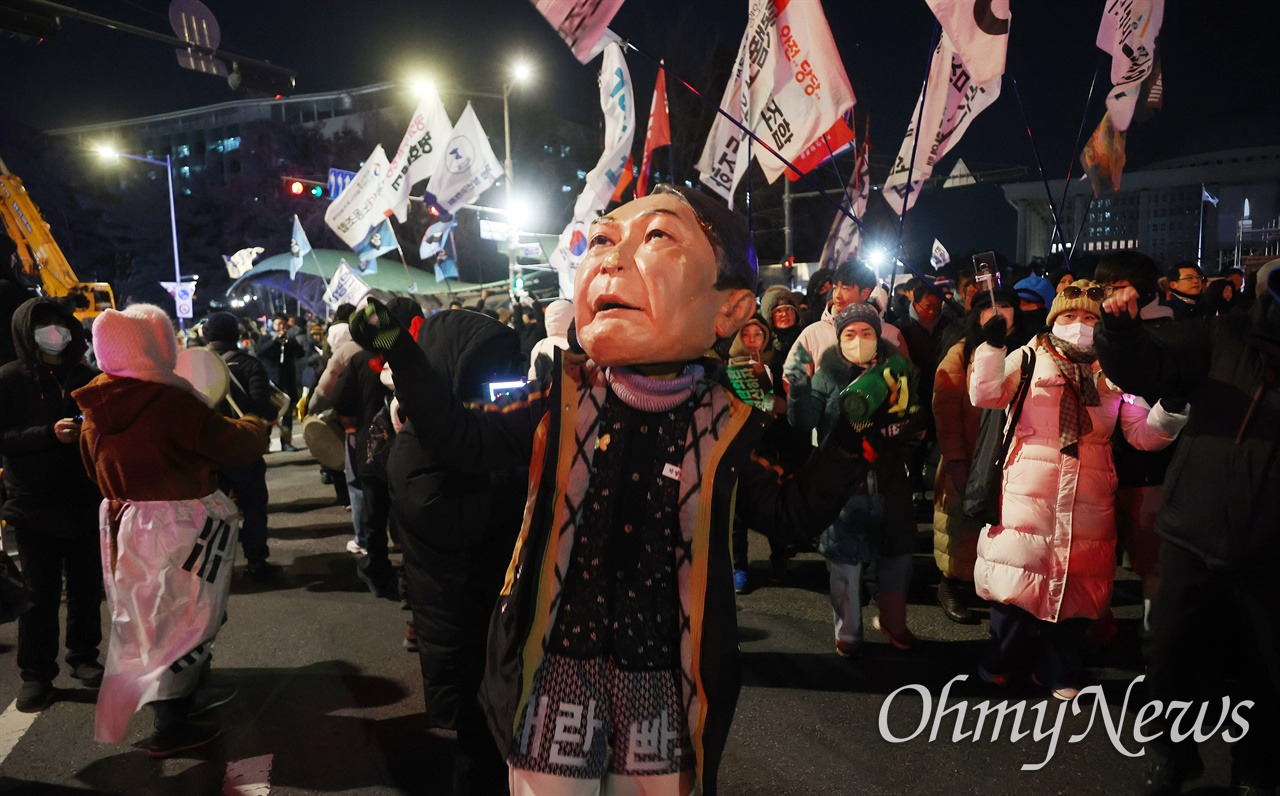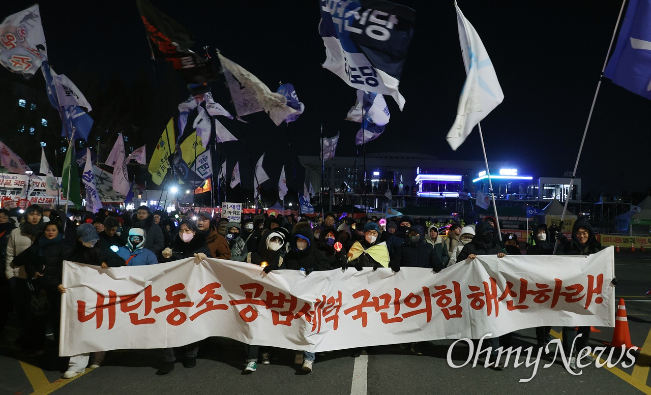 2시간 가량 집회를 이어가던 시민들은 이후 오후 9시경 노래 '다시 만난 세계', 민중가요 '임을 위한 행진곡'에 맞춰 국민의힘 당사로 행진했다. 빼곡한 응원봉 불빛으로 도로를 가득 메우며 행진한 시민들은 "추경호 영장 기각 규탄한다", "국힘당 해체하라" 등의 구호를 외쳤다. < 정초하 기자 >