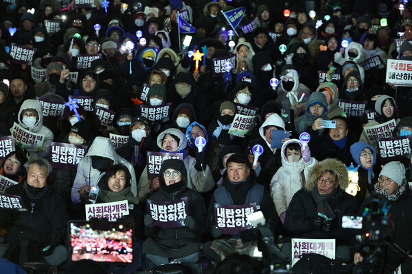 3일 오후 7시 국회 앞 대로변은 '12.3 내란외환 청산과 종식, 사회대개혁 시민대행진'에 참여하기 위해 모여든 시민들로 가득했다. 3만여명(주최측 추산)의 시민들이 매서운 한파 속에도 핫팩, 패딩, 귀마개, 목도리 등으로 중무장한 채 광장의 불빛을 밝혔다. '내란 외환 청산하자'라 적힌 피켓, 응원봉과 깃발을 여전히 손에 든 채였다. 집회 현장 옆에는 추위를 녹일 핫팩과 뜨거운 어묵탕을 나눠주는 부스들이 자리하기도 했다.