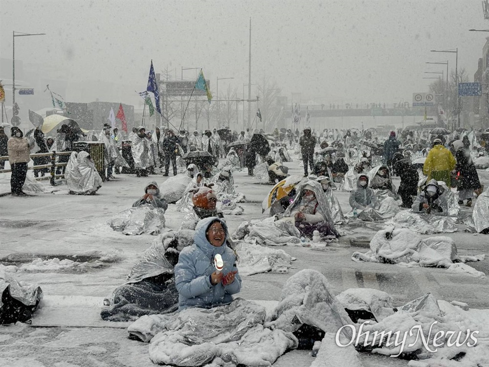 ▲지난 1월 5일, 서울 한남동 대통령 관저 앞에서 윤석열 대통령의 탄핵 및 체포를 촉구하며 집회를 연 시민들. 한겨울 눈보라와 강추위에도 보온용 은박 담요를 몸에 두르고 시위를 이어간 모습이 키세스 초콜릿을 닮아 화제가 되었다.정혜경의원실