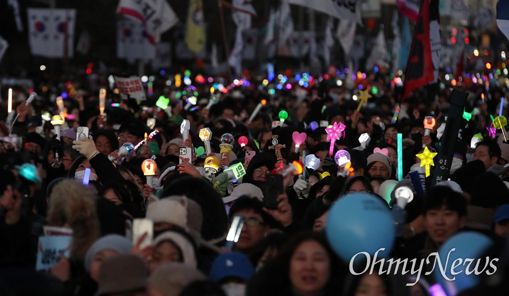 ▲지난 2024년 12월 14일 윤석열즉각퇴진·사회대개혁 비상행동 주최로 서울 영등포구 국회 앞에서 열린 '내란수괴 윤석열 즉각 탄핵 범국민 촛불 대행진'에서 시민들이 윤석열 대통령의 탄핵소추안 표결에서 탄핵 투표가 가결된 뒤 응원봉을 흔들며 노래를 합창하고 있다.이정민