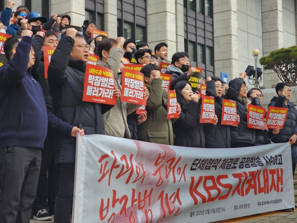 박 본부장은 이어 “내란 정권은 윤석열 파면으로 막을 내렸지만 윤석열이 수신료 분리징수를 추진하고 박민을 통해 시행했던 KBS 파괴는 파우치 박장범이 끝까지 진행하고 있다”라며 “단체 협약 체결을 위해 2년 동안 두 번의 쟁의행위 찬반 투표를 진행했다. KBS를 국민의 방송, 공영방송 이름에 부끄럽지 않은, 자랑스럽게 나의 직장으로 말할 수 있는 KBS로 만들 것”이라고 목소리 높였다.