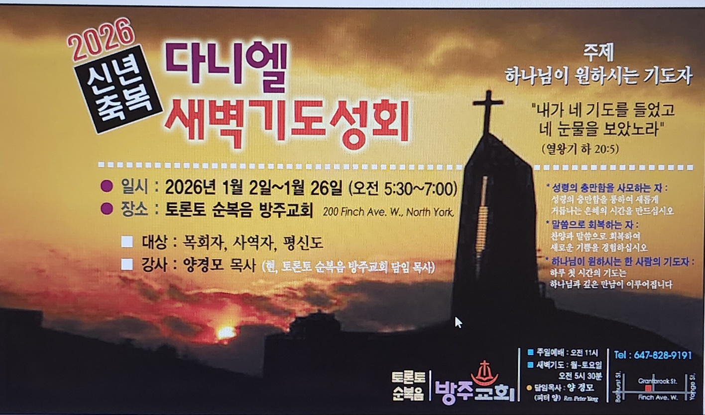 토론토 순복음 방주교회(담임 양경모 목사: 200 Finch Ave. West, M2R 3W4)가 2026 새해 1월 신년축복 다니엘 새벽기도성회를 열어 성도들의 영적 부흥과 신앙성숙의 한해를 열어간다.