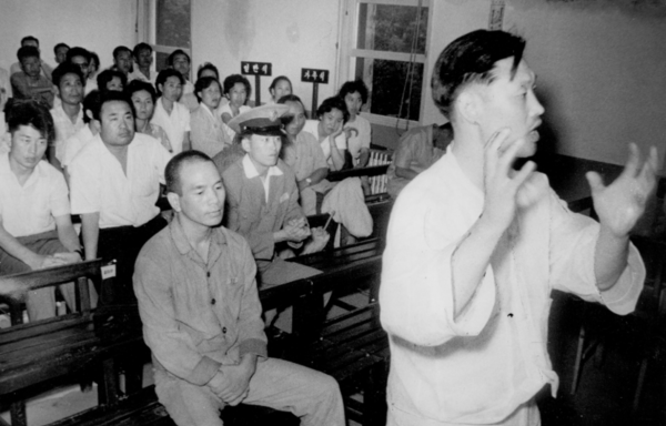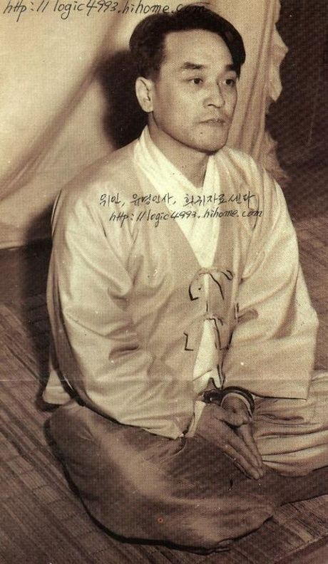 혁명재판소 재판정에서 이정재에게 모든 책임을 돌리는 임화수와 처연히 바라보는 유지광. 둘다 사형선고를 받았으나 임화수만 집행되었고 유지광은 감형되었다,