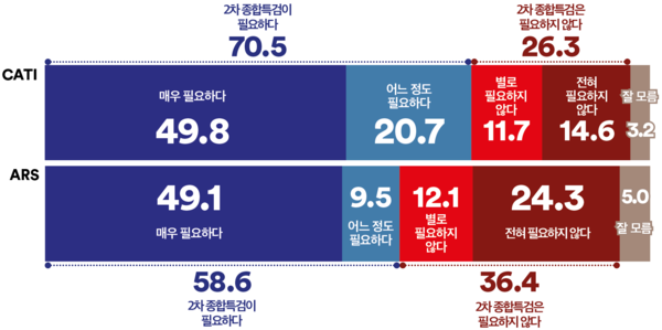 여론조사꽃(이하 꽃)이 12월 19일부터 20일까지 이틀간 1004명(응답자 이념성향: 진보 267명, 중도 441명, 보수 225명)을 대상으로, ‘2차 종합특검’의 필요성에 대한 인식을 전화면접조사(표본오차 ±3.1%포인트, 신뢰수준 95%)한 결과 70.5%가 ‘필요하다’고 응답했다. 반면, ‘필요하지 않다’는 응답은 26.3%에 그쳐 특검 찬성 여론이 반대보다 44.2%p 더 높았다. 국민 10명 중 7명 이상이 2차 종합특검이 도입에 공감하는 것으로 나타났다.