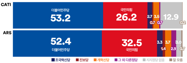 같은 기간 진행된 ARS조사에서는 ‘더불어민주당’이 전주 대비 4.9%p 하락한 52.4%를 기록했다. ‘국민의힘’은 3.8%p 상승한 32.5%를 기록하며 30%대를 회복하며, 양당 간 격차는 19.9%p로 축소됐다.