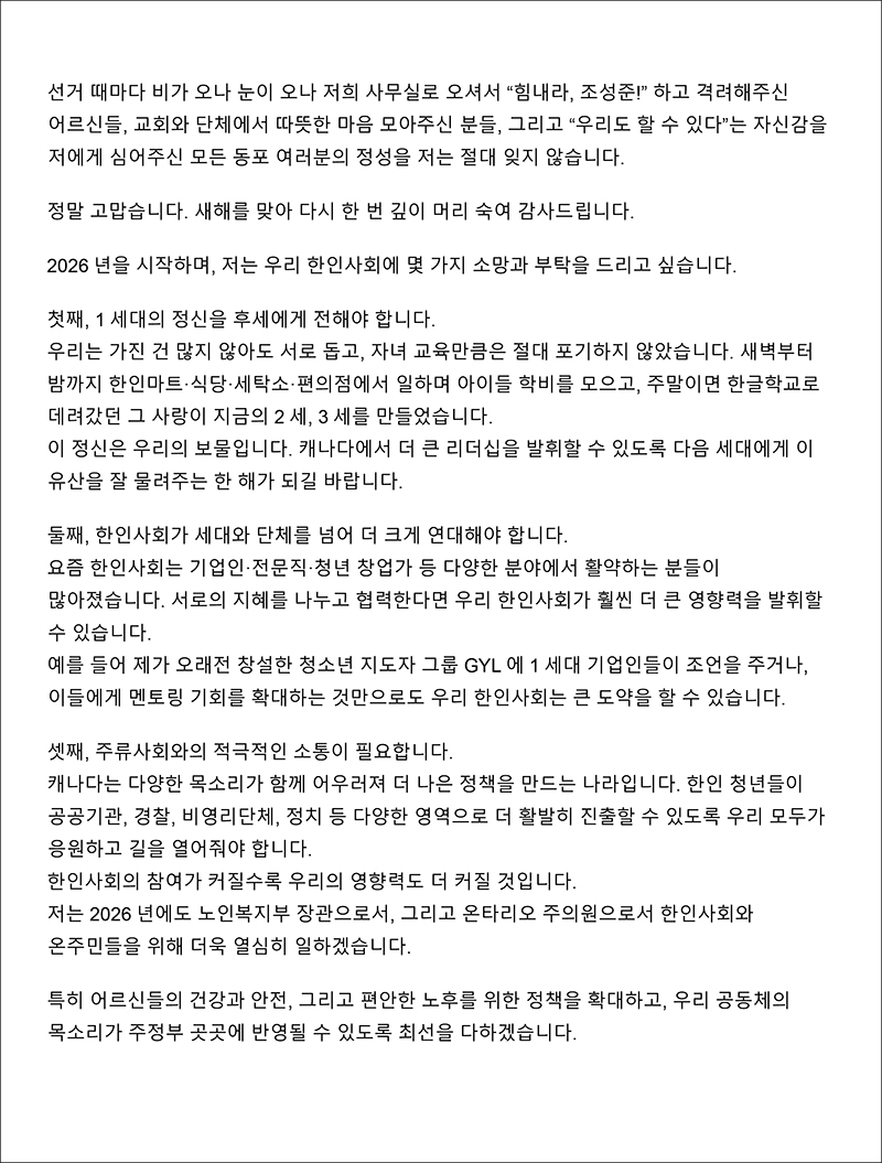 조 장관은 아울러 “2026년에도 노인복지부 장관으로, 그리고 온타리오 주의원으로 한인사회와 온주민들을 위해 더욱 열심히 일하겠다.”고 다짐했다.