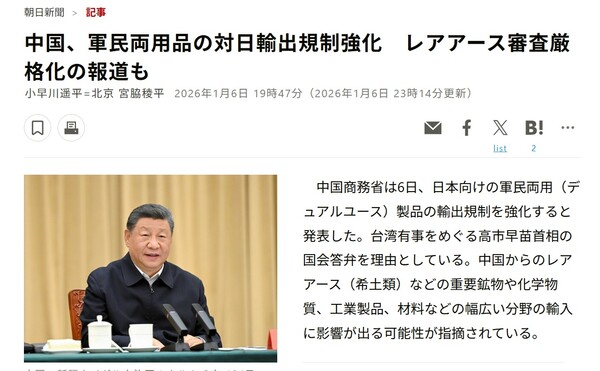 아사히는 또 다카이치 총리 국회발언 이후 중일이 충돌하면서 중국이 자국민의 일본여행을 제한하고 일본산 수산물 수입을 금지하는 등의 제재조치를 취해왔으나 “이제까지 경제적인 영향은 한정적이었다”면서, 그러나 이번 수출 규제 강화로 “중국의 대일 압력이 한 단계 더 올라갈 것”으로 예상했다.