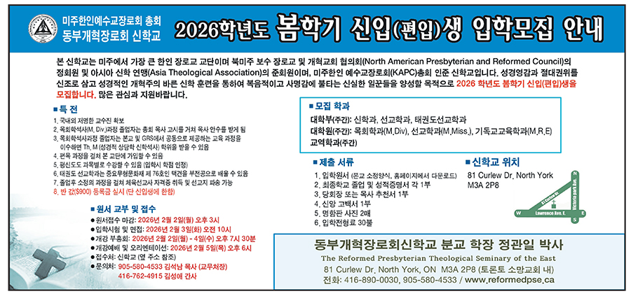 원수접수는 오는 2월2일 오후 3시까지 노스욕 81 Curlew Drive.North York, M3A 2P8) 소재 소망교회 내에 있는 신학교 사무실에서 받는다. 입학원서는 학교 웹사이트 www.reformedpse.ca에서 다운받고 졸업·성적증명서와 신앙고백서, 추천서 등 관련 서류들과 $30의 전형료를 납부하면 된다.