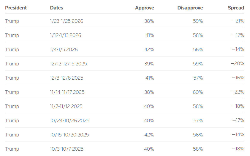 26일 로이터 통신은 여론조사기관 입소스를 통해 미국 성인 1139명을 1월23일~25일간 조사한 결과 트럼프 대통령 국정수행 지지율이 38%로 나타났다고 보도했다. 이는 1월 12~13일 조사 당시의 41%에서 하락한 수치다. 이번 여론조사는 지난 24일 이민단속 반대 시위가 벌어지던 중 이민단속 요원이 미니애폴리스에서 두번째로 시민 알렉스 프레티(37)를 사살한 사건을 전후해 이뤄졌다.
