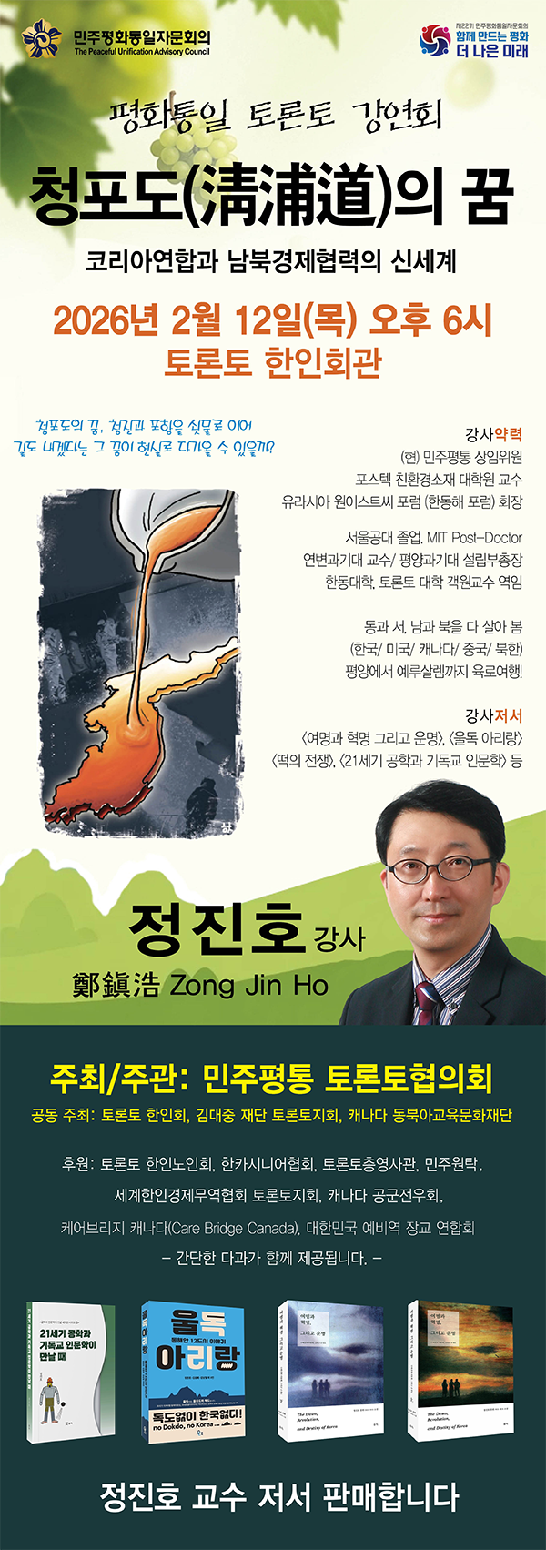 민주평통 상임위원이며 한동해포럼 회장인 정진호 교수(포스텍 친환경소재 대학원, 전 평양과기대 설립 부총장)가 오는 2월12일(목) 오후 6시 토론토 한인회관에서 ‘청포도의 꿈 - 코리아 연합과 남북 경제협력의 신세계’라는 주제로 평통 토론토협의회(회장 이병룡)가 주최하는 평화통일 강연회를 갖는다.
