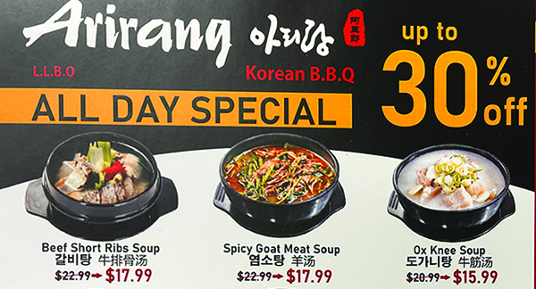 쏜힐 스틸스 소재 한식전문 대중음식점인 「아리랑」(구 서울관: 180 Steeles Ave. W. Unit 24, Thornhill ON L4J 2L1) Korean BBQ가 새 봄을 맞아 새 메뉴를 추가하고 음식값을 내리는 등 특별 고객맞이 행사에 들어갔다.