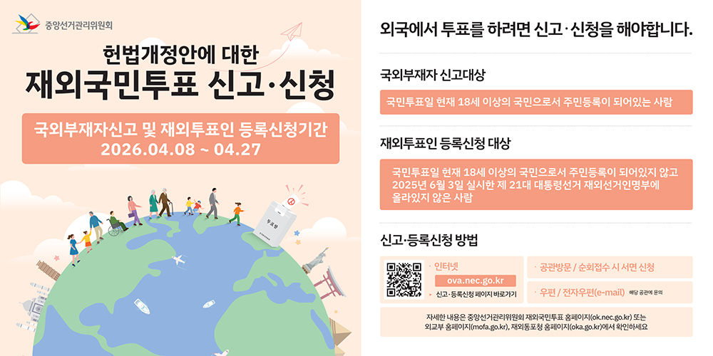모국정부가 헌법 개정안을 공고함에 따라 중앙선거관리위원회가 6월 지방선거 동시 개헌안 투표에 대비한 재외국민투표 준비에 들어갔다. 6.3 국민투표가 실시될 경우 재외국민이 투표에 참여하려면 4월27일(월)까지 국외부재자 신고와 재외투표인 등록 신청을 해야 한다.