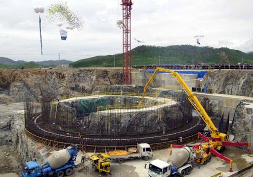 미국 정부는 1994년 10월21일 ’제네바 기본합의서’를 통해 북한에 ’비핵화’의 대가로 경수로형 핵발전소 2기를 지어주겠다고 공식 약속했다. 이를 근거로 한반도에너지개발기구가 북한 함경남도 신포지구에 짓던 한국형 경수로 핵발전소의 원자로 기초콘크리트 타설공사(2002년 8월7일) 모습. 케도 누리집 갈무리