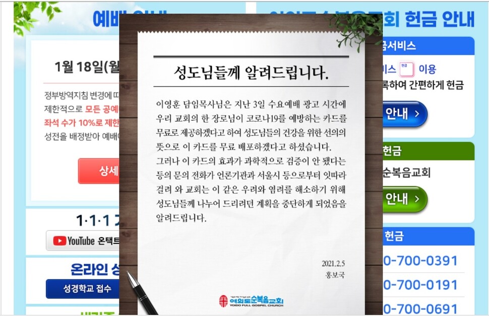 신자수에서 세계 최대 규모로 손꼽히는 여의도순복음교회가 코로나19바이러스부터 몸을 지켜준다는 이른바 ‘안티 코로나 바이러스 카드’를 모든 신자들에게 나눠주려다가 파장이 커지자 5일 이를 중단했다.