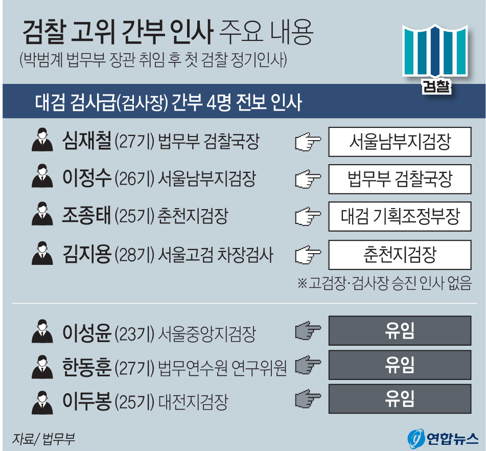 아울러 "현재 진행중인 주요 현안 사건을 지휘하는 서울중앙지검장, 대전지검장을 비롯한 대부분의 검사장을 유임시켜 새롭게 시행되는 제도의 안착과 업무의 연속성을 도모했다"고 부연했다.
