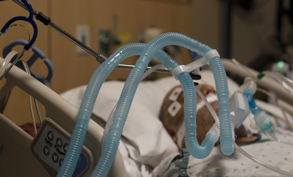 인공호흡기를 부착한 미국의 코로나 중증 환자