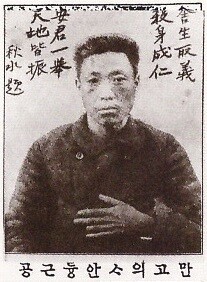 미국 샌프란시스코 교민사회의 신문 <신한민보>의 1910년 3월30일치 논설에 실린 고토쿠 슈스이의 찬양 한시가 붙은 안중근 의사의 사진. 고토쿠가 갖고 있다가 미국의 동지들에게 영문 설명을 받기 위해 보내준 안 의사 사진엽서 견본을 그대로 싣고 제목을 ‘만고 의사 안중근 공’이라고 표기한 것이 눈에 띈다. 당시 안중근 의거로 한국과 일본 지식인들 사이에 촉발된 아시아 평화운동의 연대를 보여주는 희귀한 사료다.